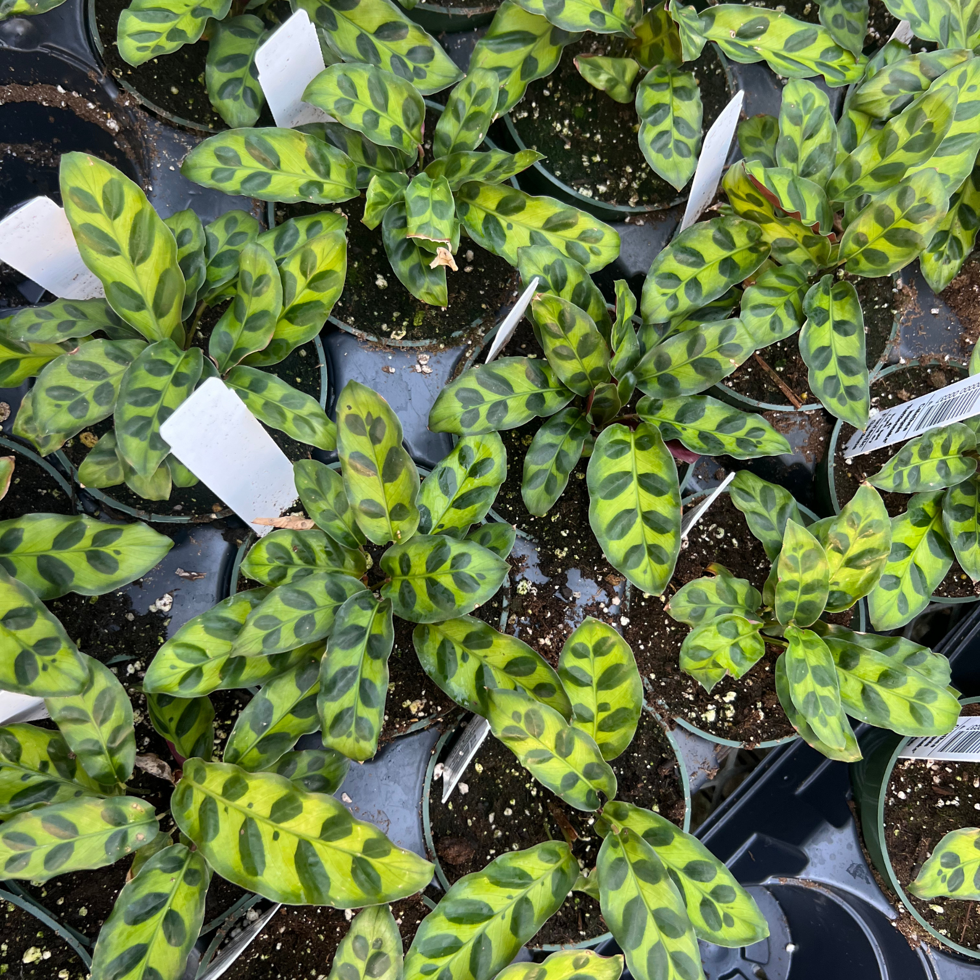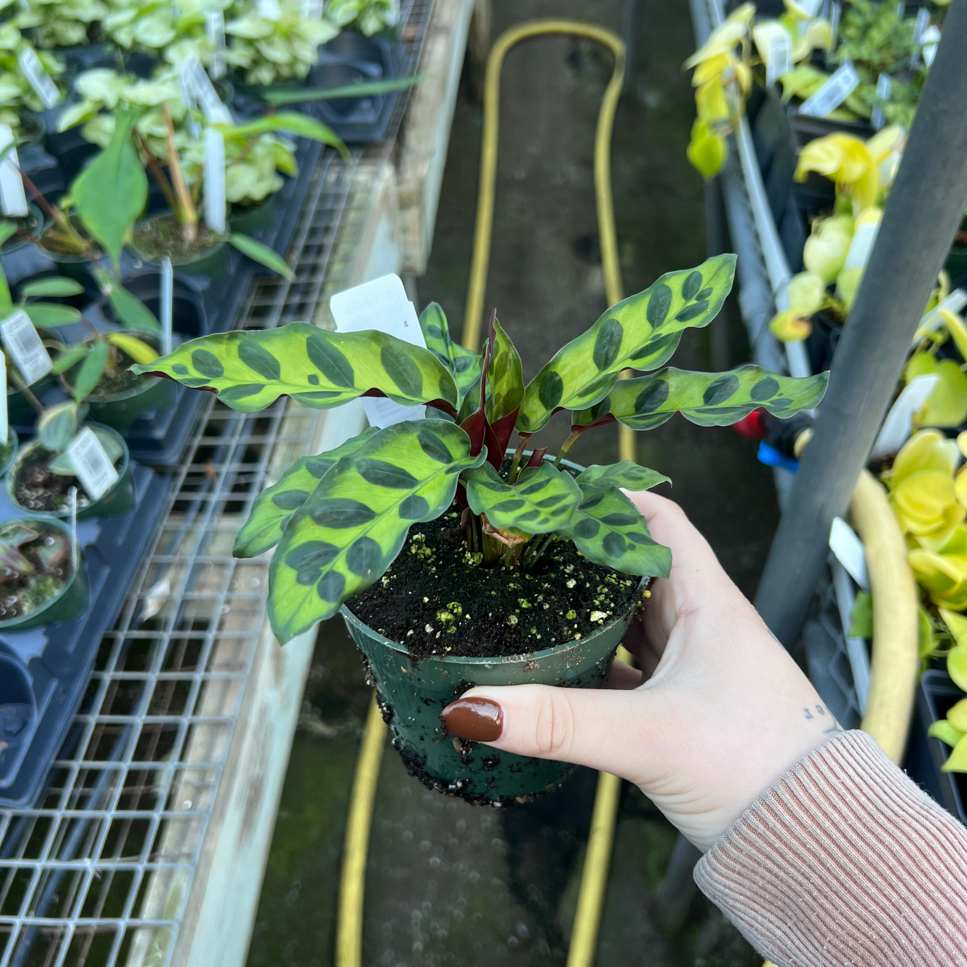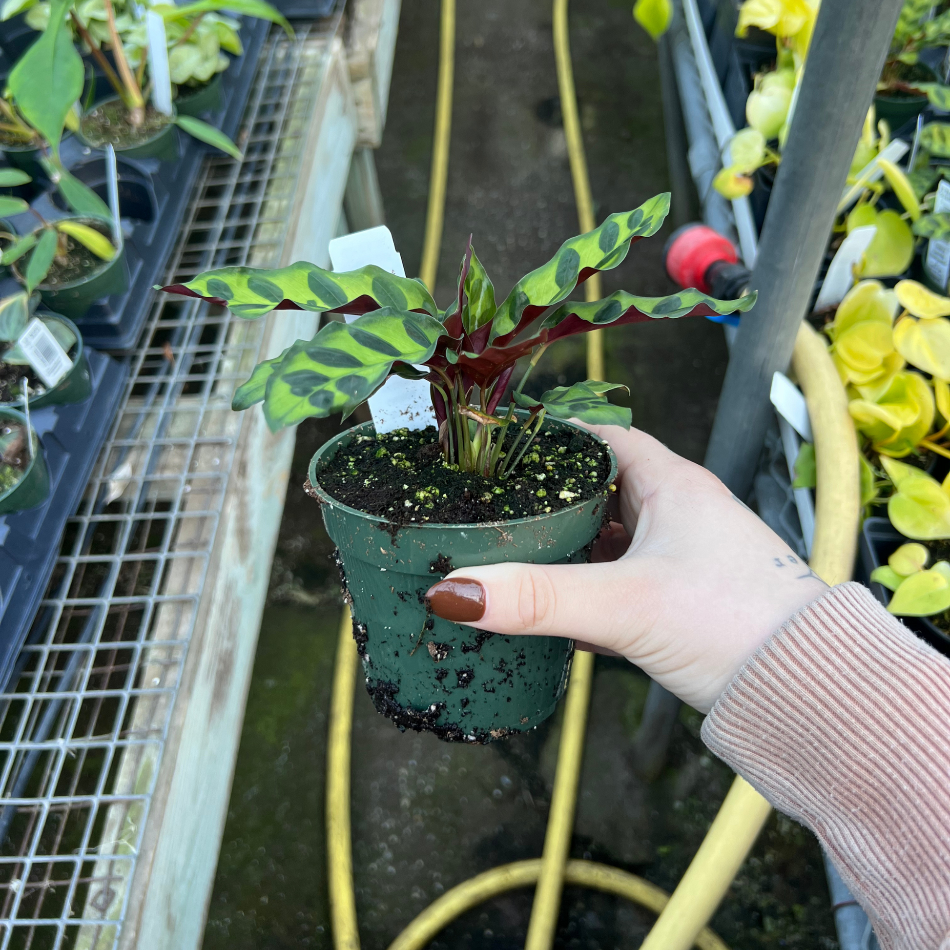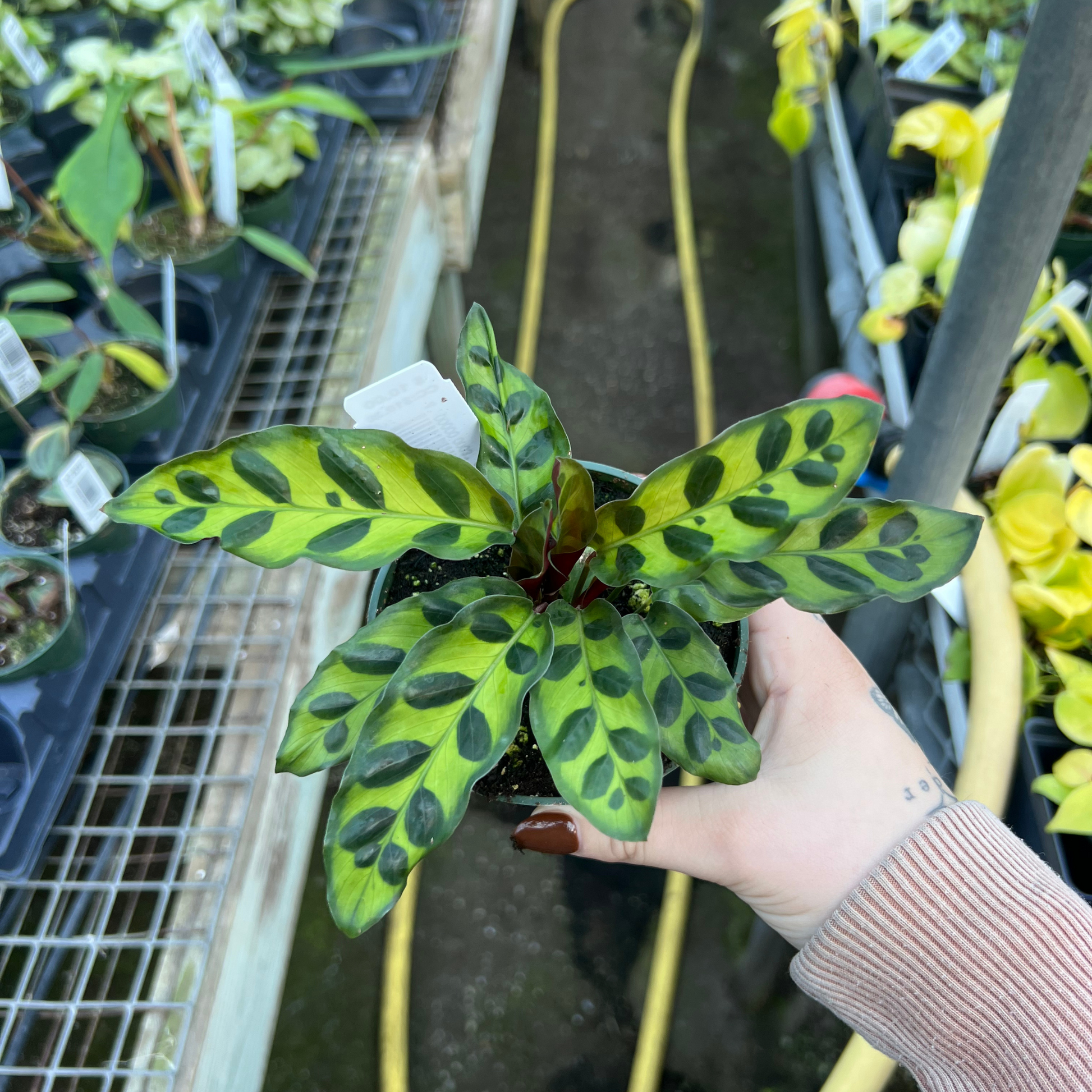 The Calathea Rattlesnake has extremely wavy leaves with fun dark green stripes! Like other calatheas the leaves are magenta on their underside, with the thin short stems that produce a tight clump of leaves.