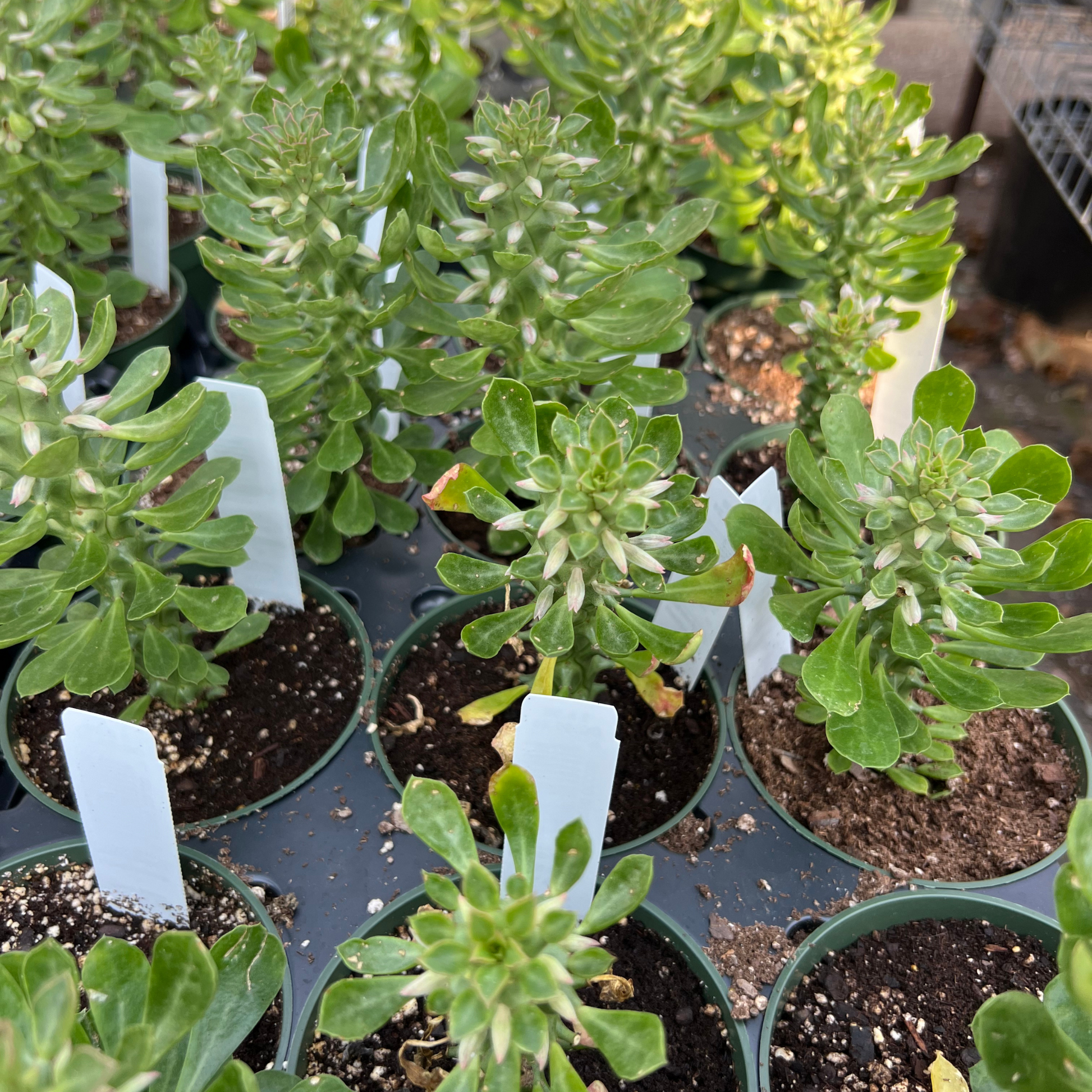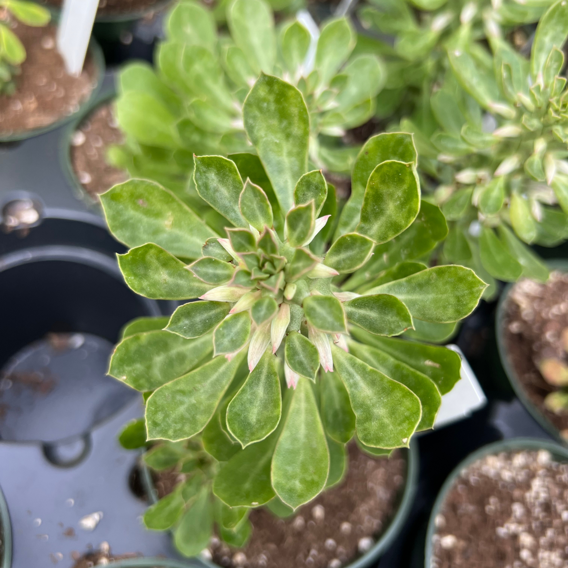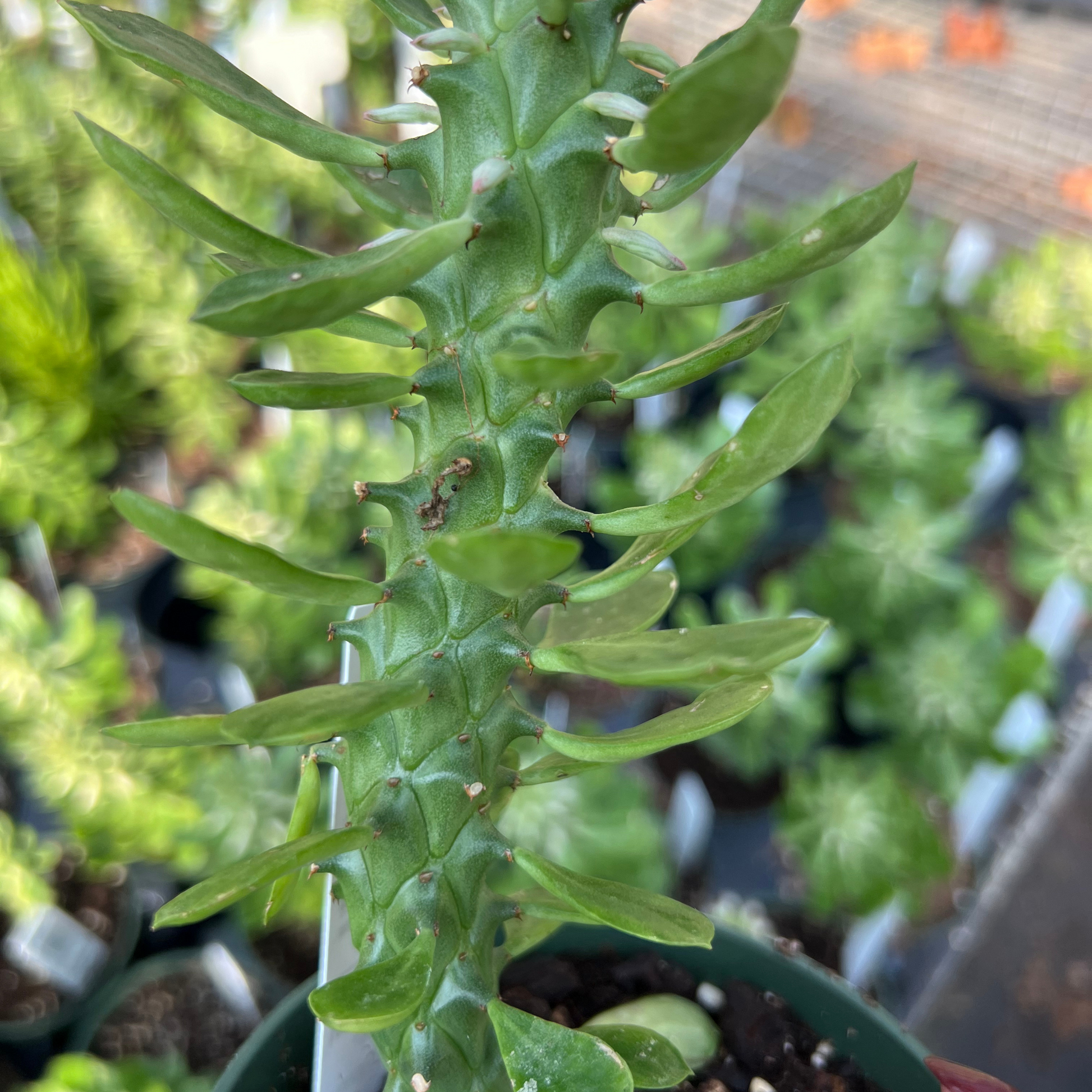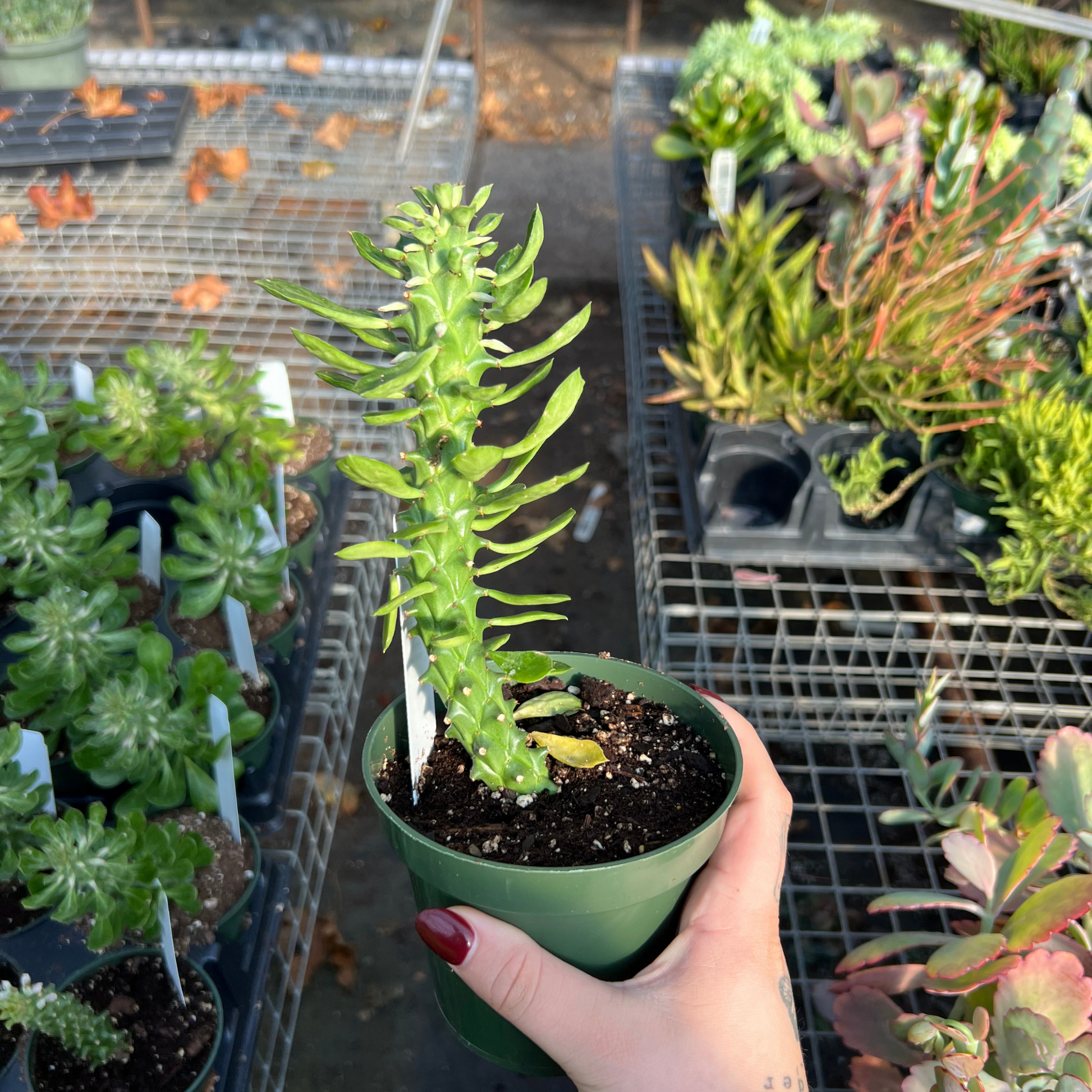 The plant's most striking feature is its long, cylindrical stems that resemble sausages. The plant produces fleshy, sickle-shaped leaves that eventually fall off.