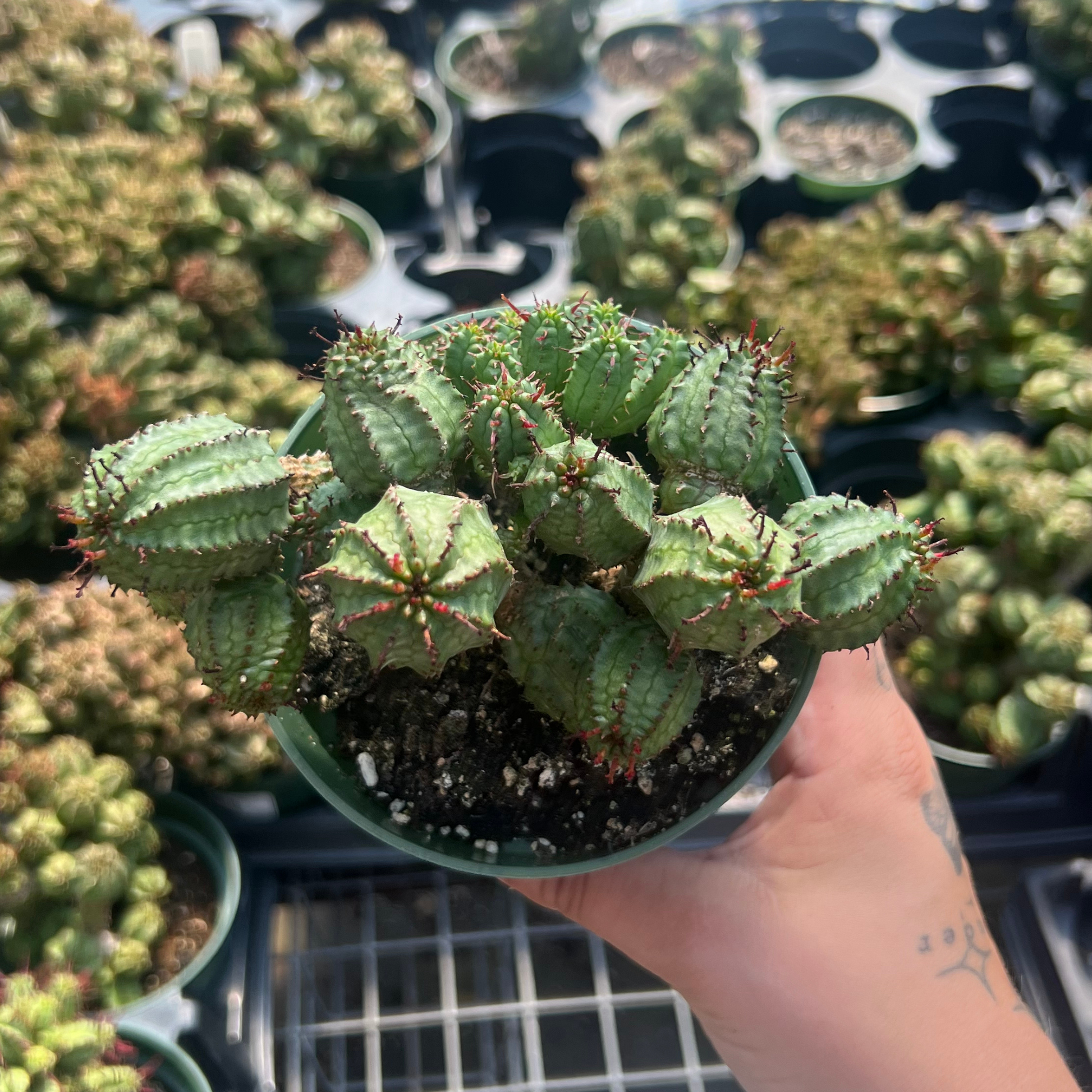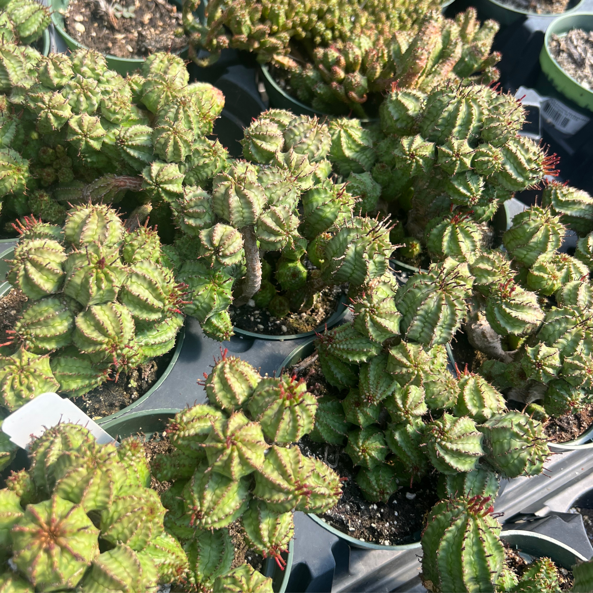 Take a look at this unique succulent plant with fleshy, cylindrical stems and small green flowers. This drought-resistant plant adds a touch of natural elegance to any space.