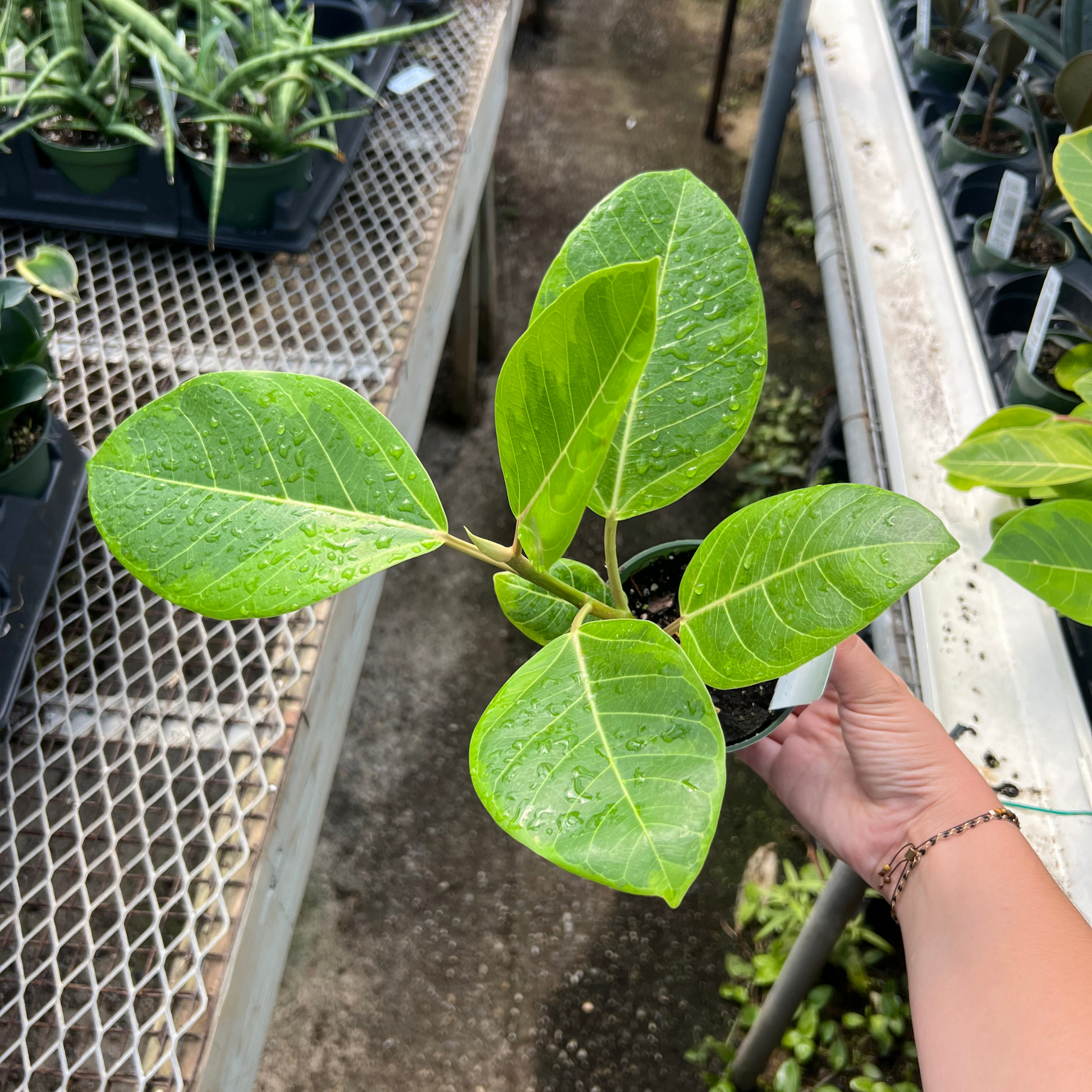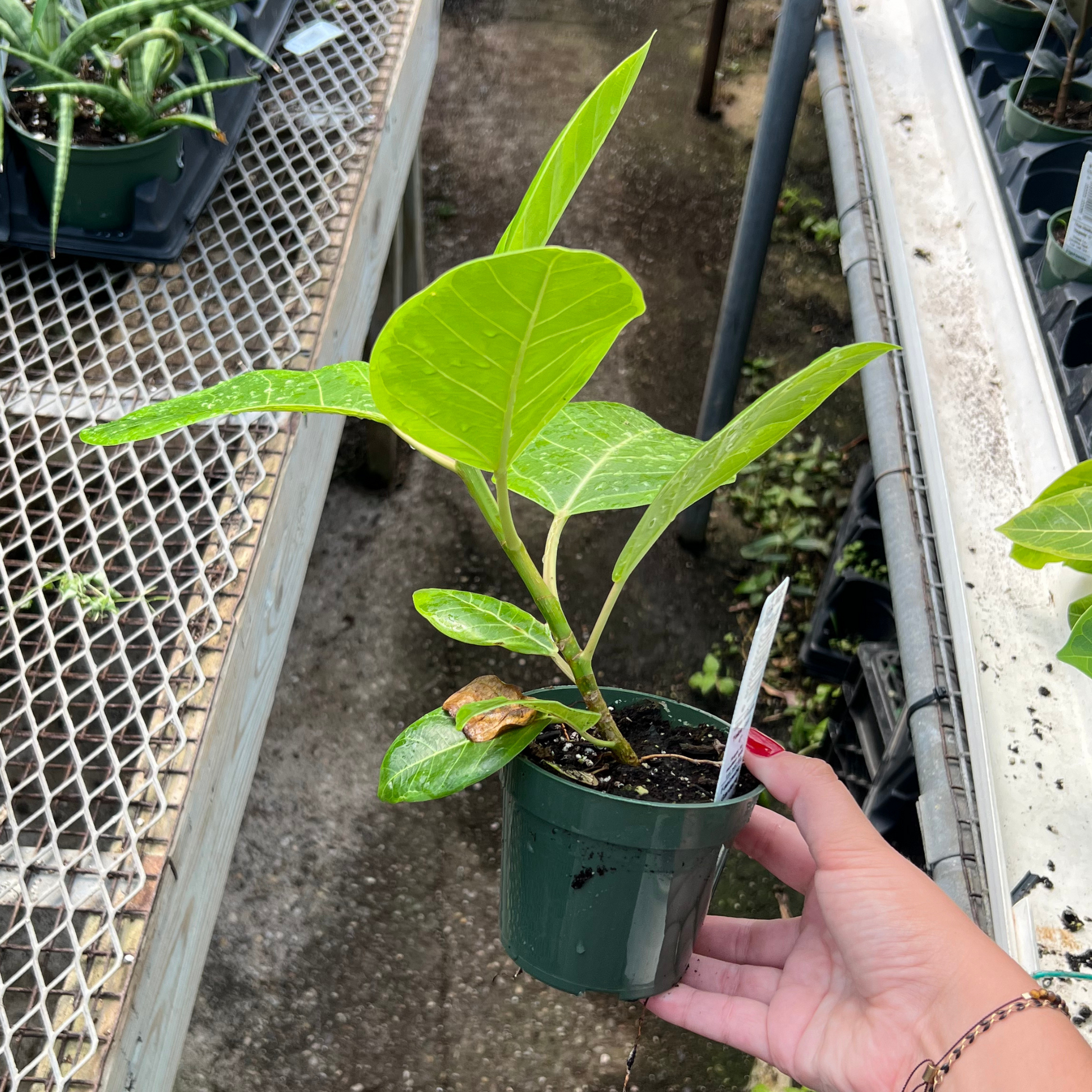 This is also very similar to the Ficus Benghalensis Audrey but it has yellow variegation to the edge of each leaf. This along with the FLF and the Ficus Audrey all grow upwards giving the plant some height to it. The waxy shine mixed with the bright color really makes this plant stand out on a shelf of green!