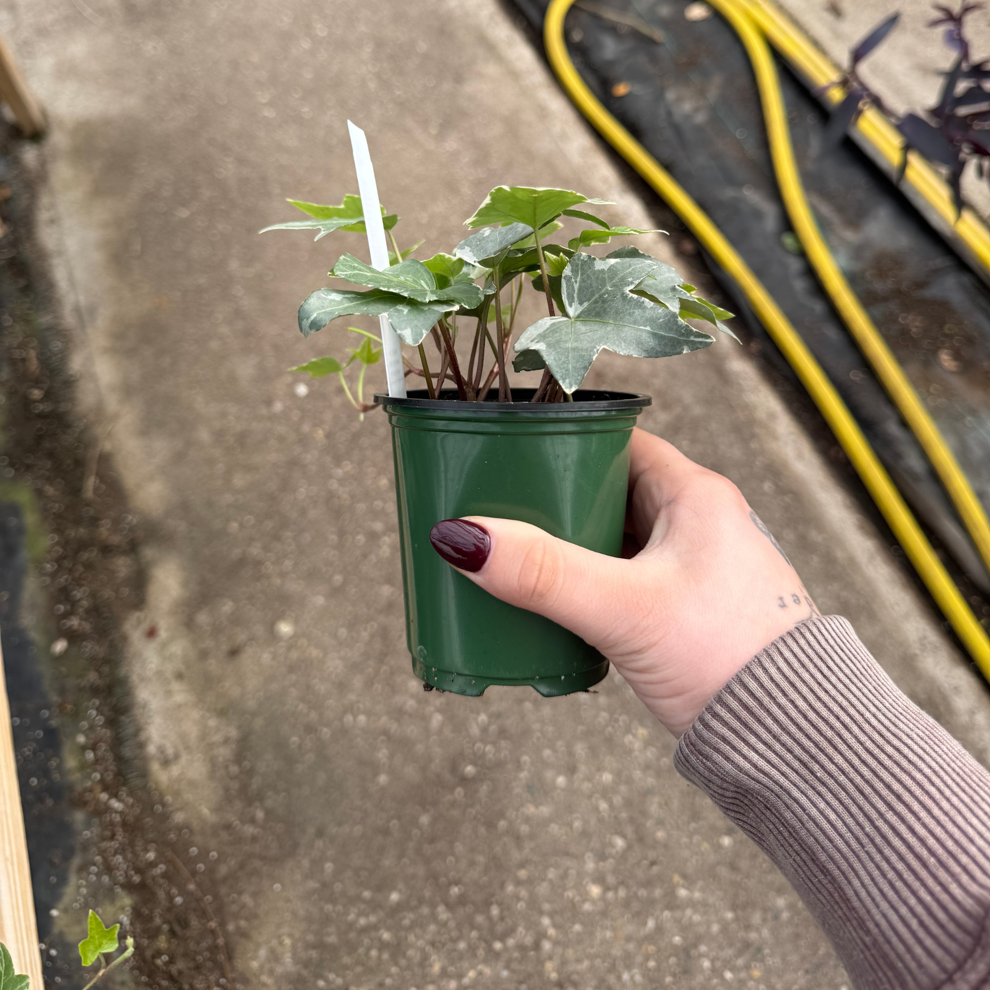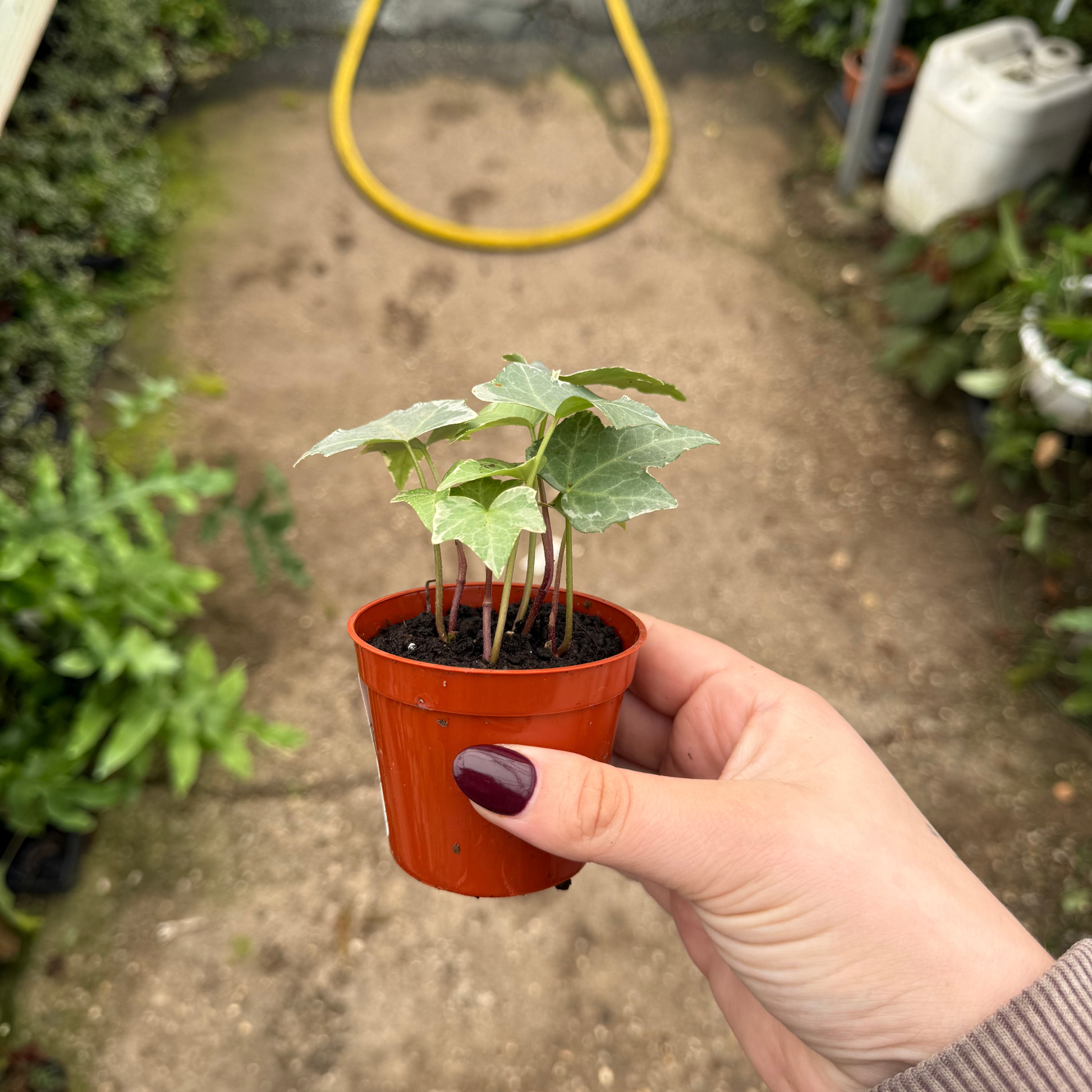 This is a compact ivy variety loved for its striking gray-green leaves edged with creamy white. Its trailing vines are perfect for hanging baskets, mixed planters, or training up small trellises. Easy to care for and adaptable to a variety of light conditions, it adds a fresh, elegant touch to any space.