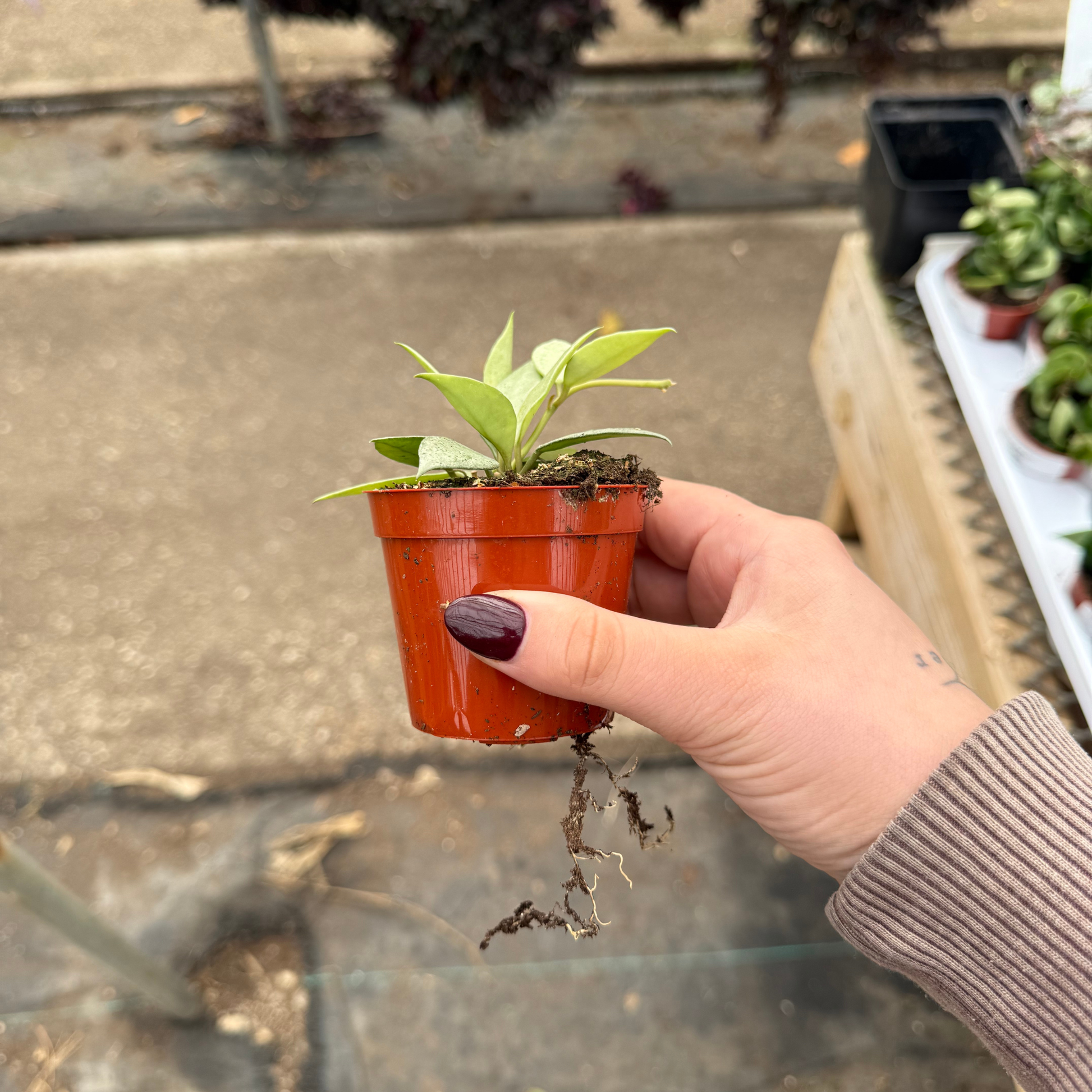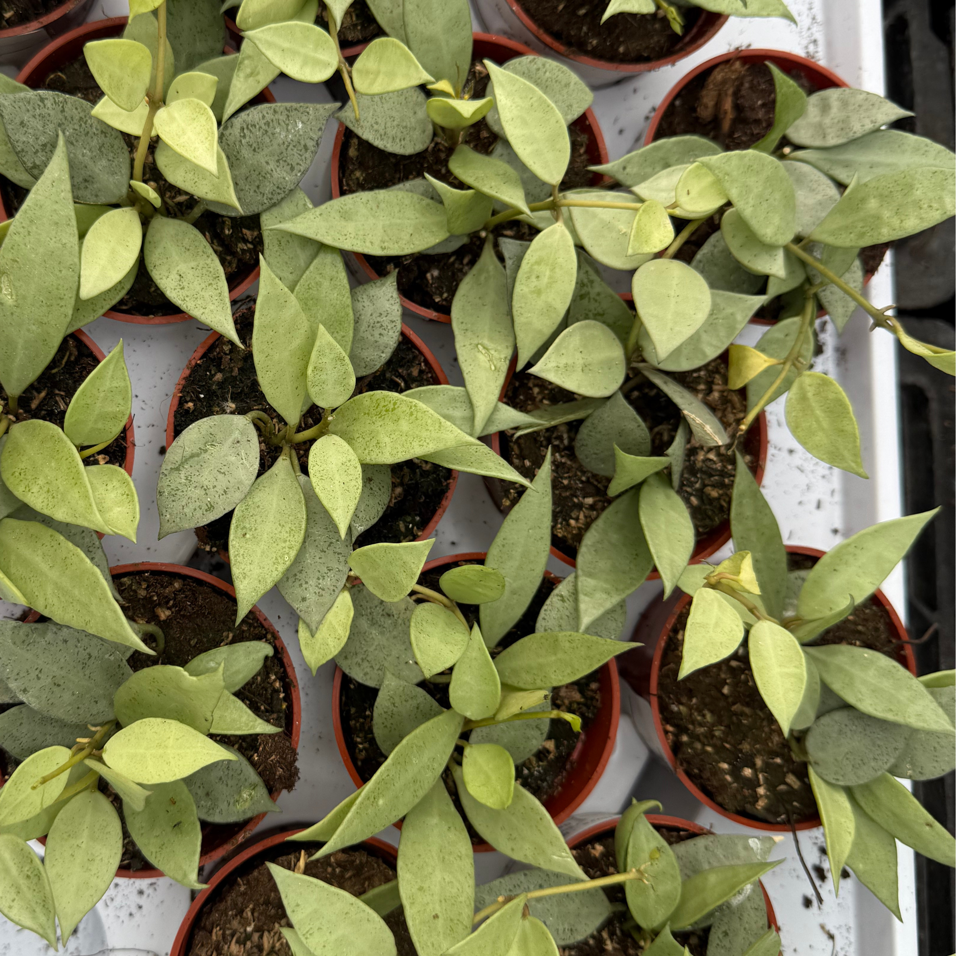 This Hoya is a beautiful, easy-care variety with thick, waxy leaves dusted in soft mint green variegation. Its trailing vines make it perfect for hanging baskets or shelves, and like all Hoyas, it thrives on bright, indirect light and minimal watering.