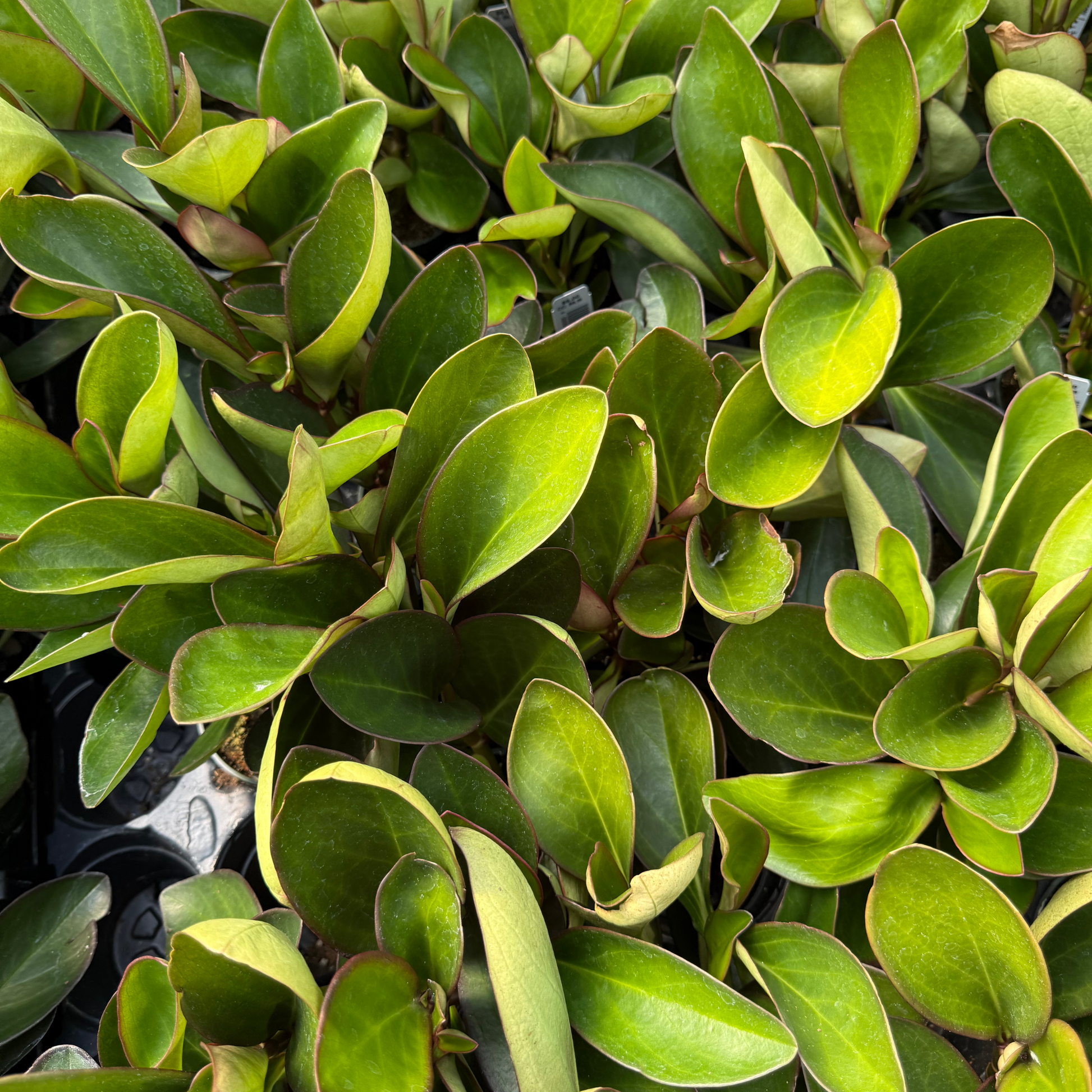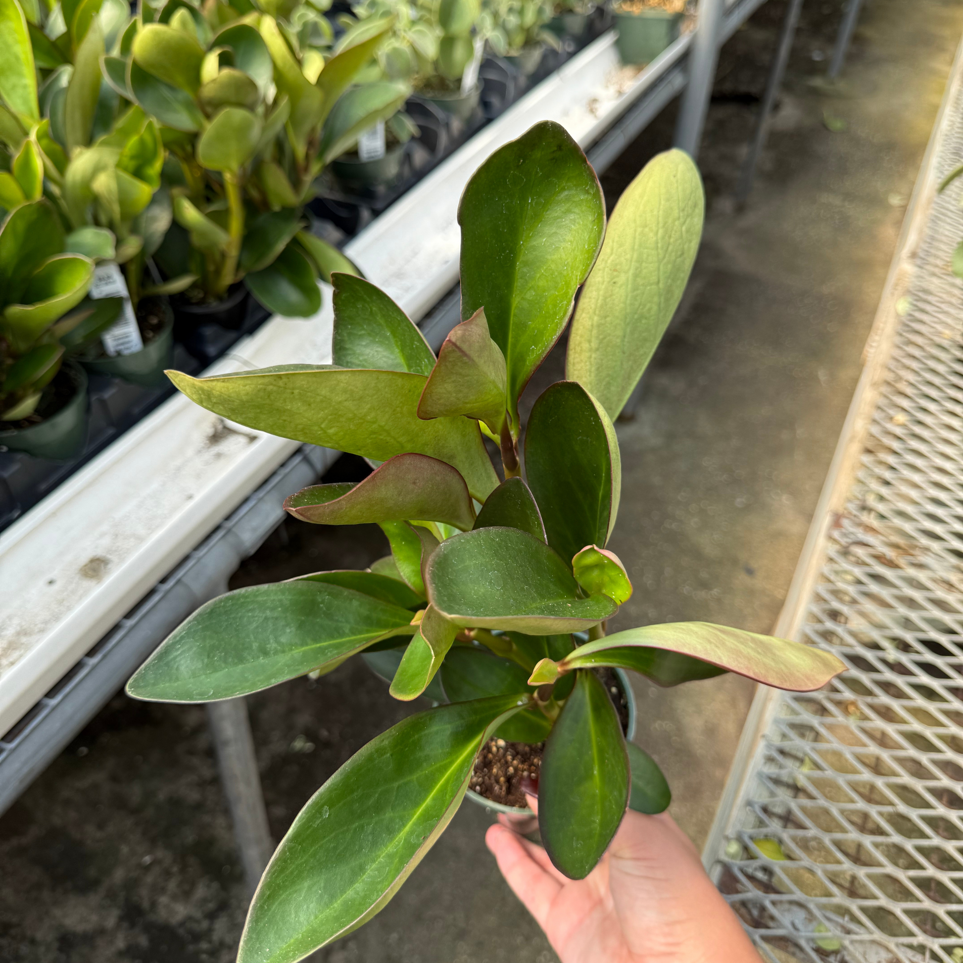A striking houseplant with thick, glossy green leaves edged in vibrant red-pink, adding bold color and texture to any space.