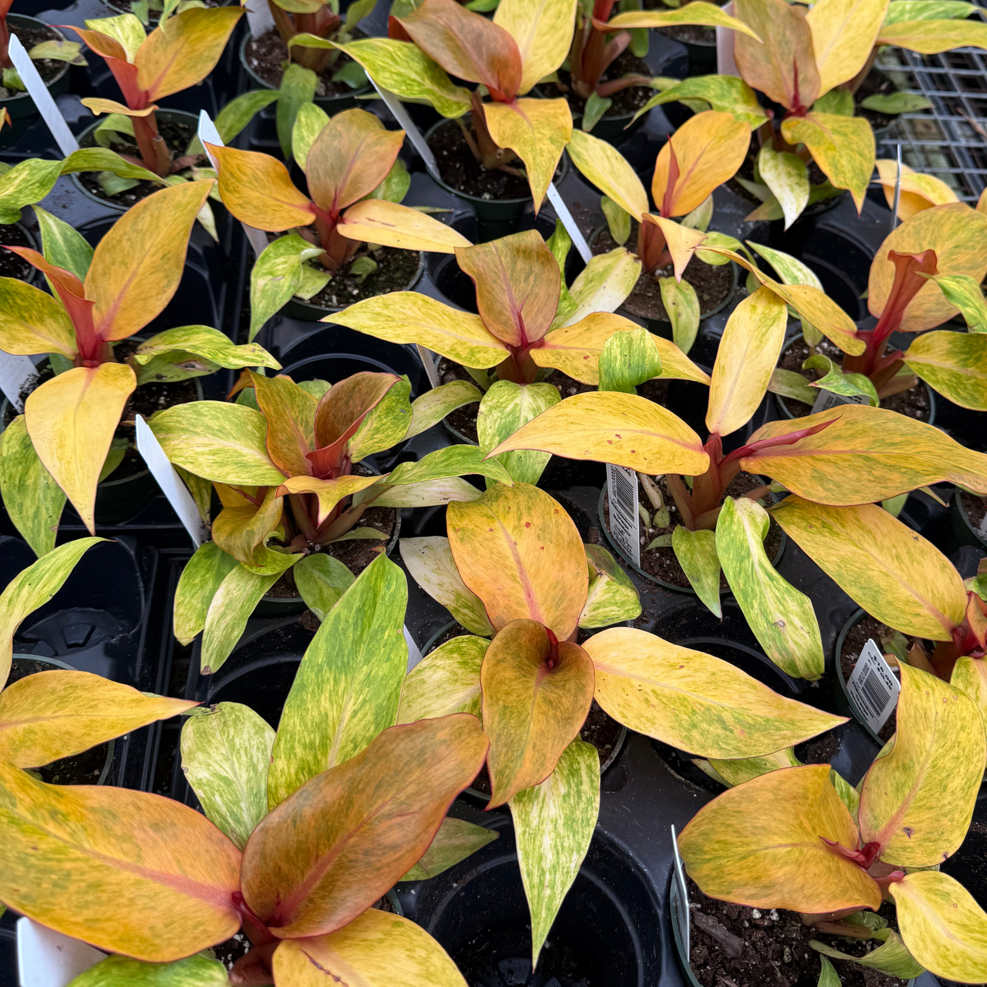 This Philodendron features glossy green leaves splashed with creamy yellow, lime, and warm orange variegation. Easy to care for and slow-growing, it thrives in bright indirect light and makes a bold statement in any indoor plant collection.