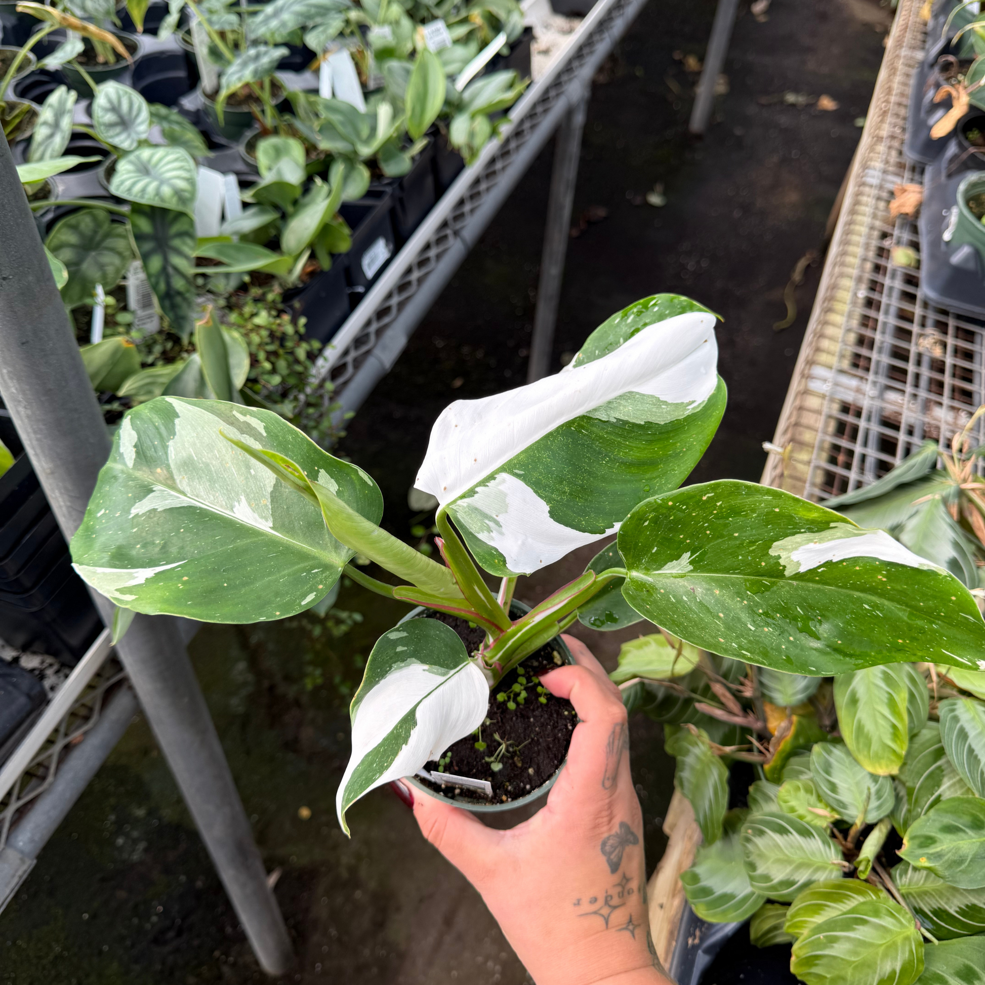 Similar to the Philodendron White Knight and White Wizard but this variety is known for having dark purple stems and half-mooned leaves. Similar to the other types it has beautiful white variegation throughout!