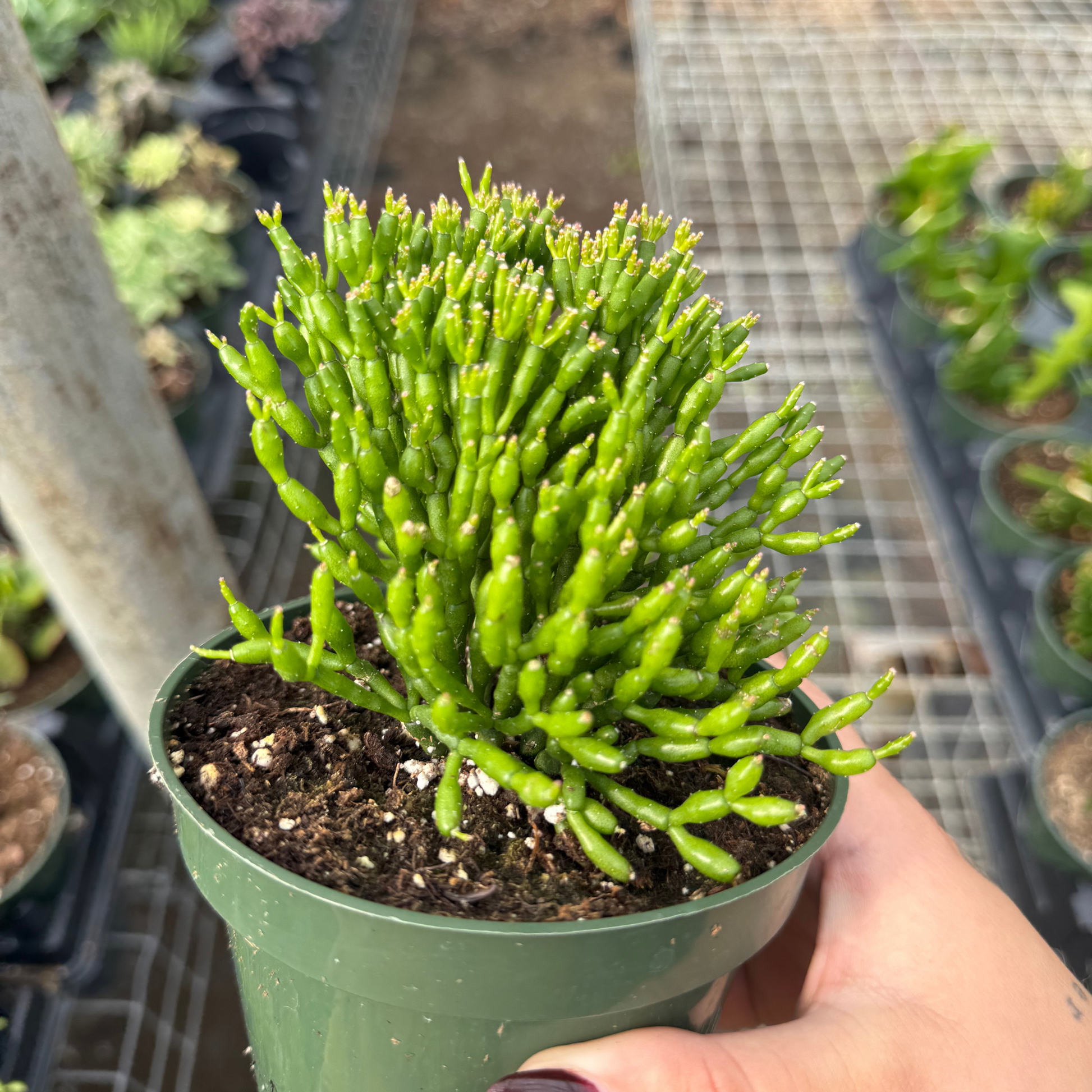 This funky succulent has thin leaves that stand up straight and as the plant grows it will begin to fill out the pots and become quite a lush plant!